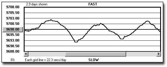 Figure 3 shows a graph of my last experimental clock over several days. The rate change seen in this graph is much smaller than what we have previously seen, though I have configured the program to "zoom in" on the data to display the change more clearly. Here the fluctuations cover about five grid lines, each of which represents a rate change of 0.1 seconds per day. This produces a 24-hour fluctuation in rate of about 1/2 second due to ambient temperature change. Note also that we can see a complex shape in the response. This is due to the complexities of the complete system; different mass in the bob and rod, the insulated wooden clock case, whether or not the furnace turns on or the sun shines in. MicroSet makes it easy to capture and display these short term changes.